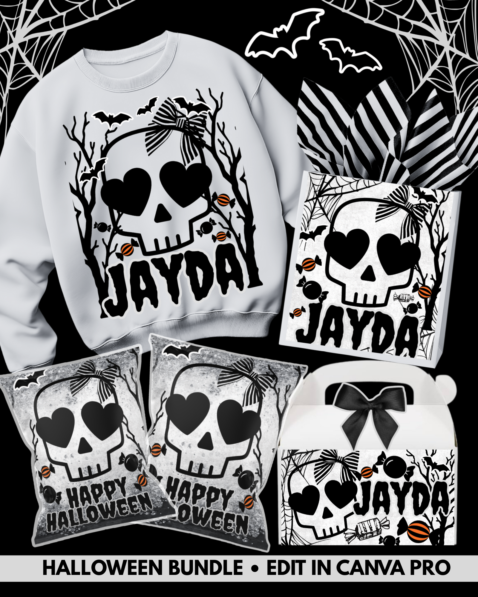 Get into the Halloween spirit with this fun and spooky Halloween Template Bundle! Designed in Canva Pro, this set makes it easy to customize your party décor, gifts, and apparel with a chic skull-and-candy theme. Perfect for Halloween parties, trick-or-treat events, and festive fall gatherings.